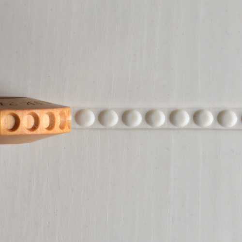 The row of dots Finger Roller has a rolling design face that is 0.8 cm (8 mm) across. The Finger Roller is beautifully carved, has unique designs, releases well, and has a smooth carved texture. Roll the FR roller across the clay with your thumb and pointer finger to create a continuous pattern. The row of dots Finger Roller is designed to roll across the clay to create straight lines, curvy lines, and borders.