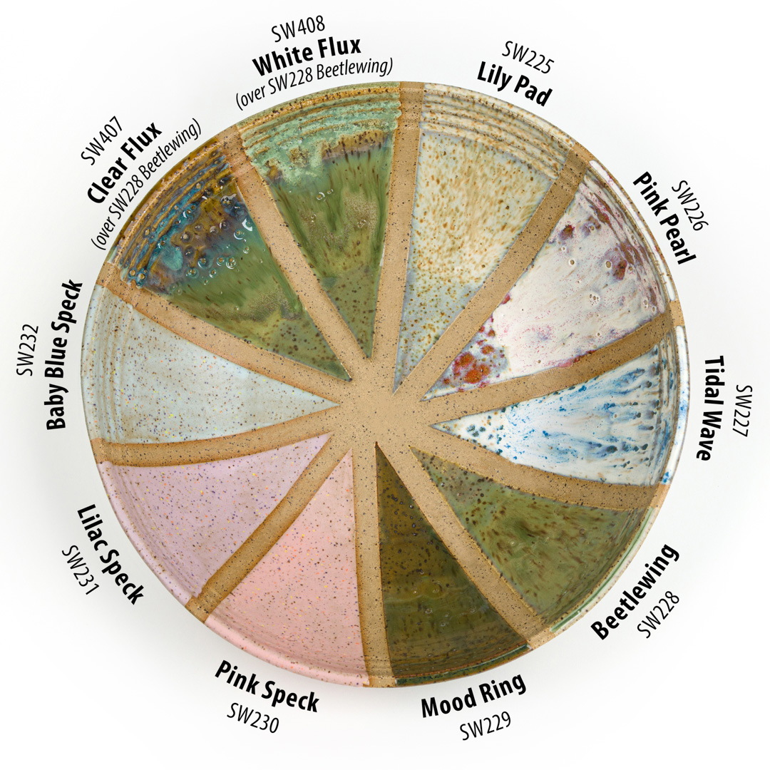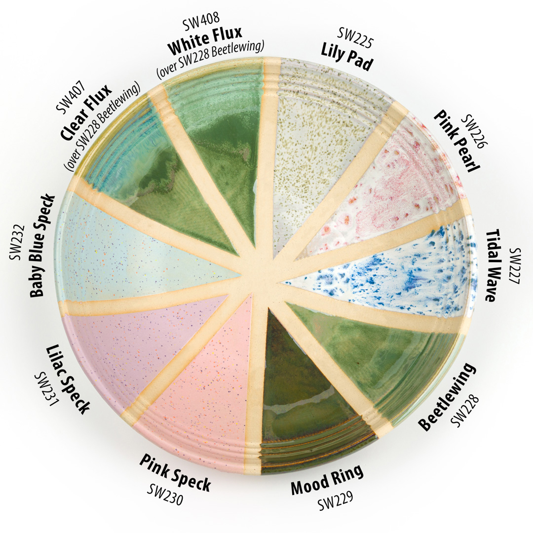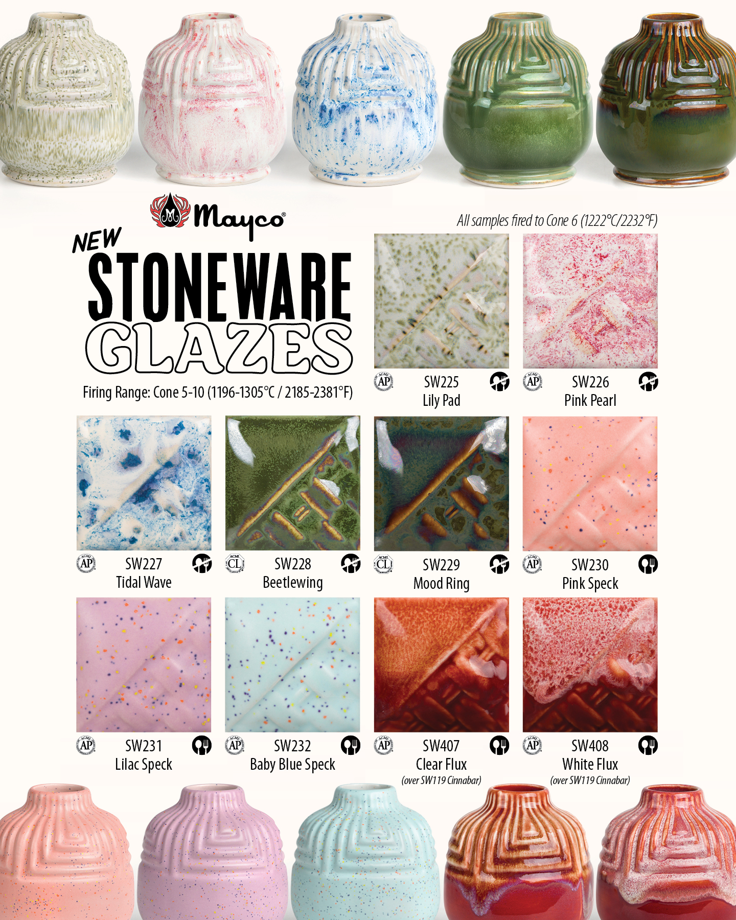 Chips shown are fired to cone 6 (1222°C/2232°F). The firing range of Mayco Stoneware glazes and Stoneware Engobe is cone 5-10 (1196-1305°C / 2185-2381°F).