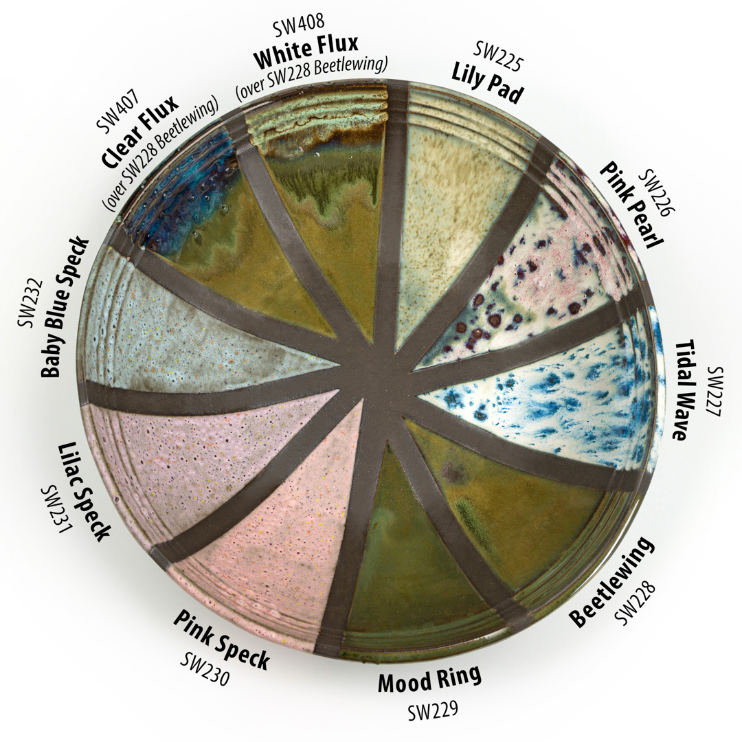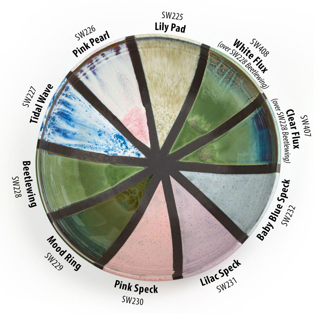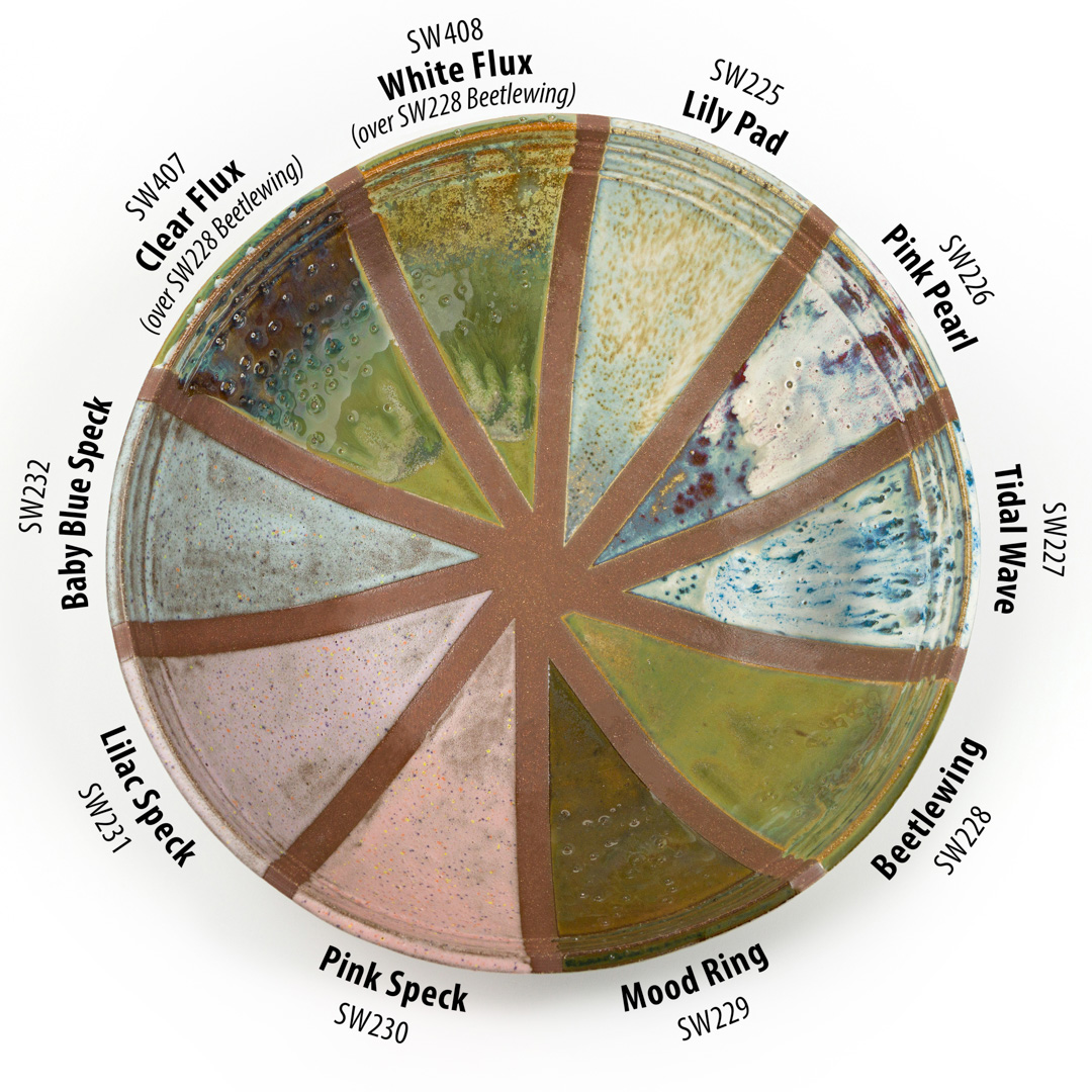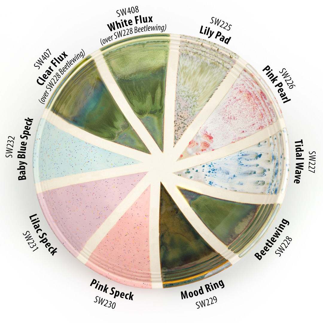 Chips shown are fired to cone 6 (1222°C/2232°F). The firing range of Mayco Stoneware glazes and Stoneware Engobe is cone 5-10 (1196-1305°C / 2185-2381°F).