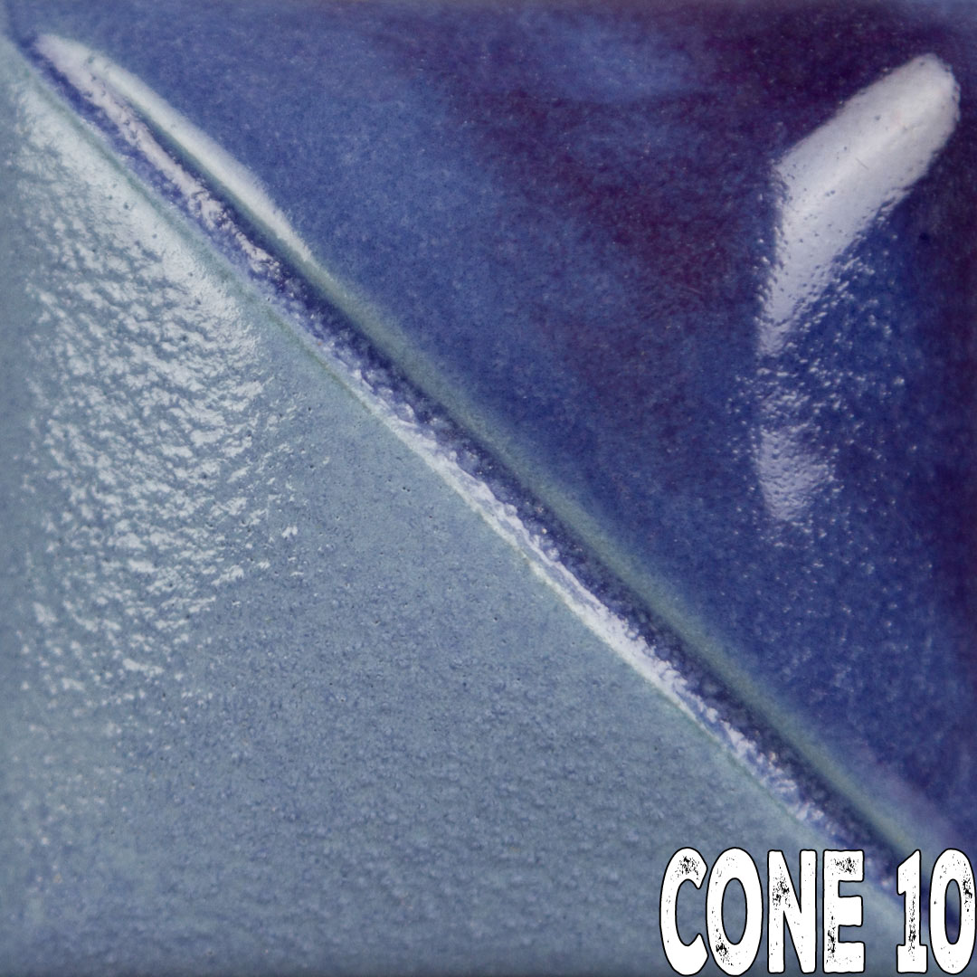 Color shifts blue with purple variegation. Recommended clear glaze is SW-001 Stoneware Clear.